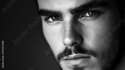 face, man, portrait, black, white, shadow, light, skin, nose, eye, eyebrow, lip, beard, hair, close, up, detail, expression, emotion, serious, confident, photogenic, male, gaze, chin, cheek, forehead, texture, smooth, rugged, stubble field, dark, highlight, studio, elegant, aesthetic, classic, dramatic, strong, mature, frontal, symmetric, visual, soft, deep, focused, intensity, look