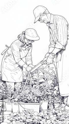 A black and white sketch of a man and a child gardening together.
