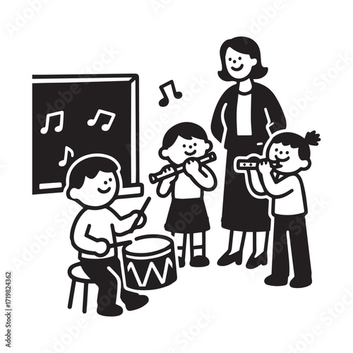 A black and white vector illustration of children in a classroom playing music together.