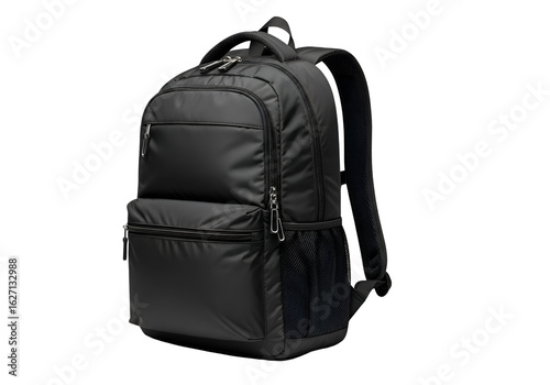 A black backpack with multiple pockets.