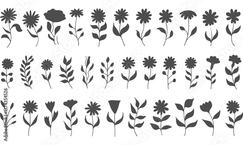 botanical, flower, floral, tree branch, plant, leaf, silhouette, vector, nature, illustration, background, art, abstract, white background, black, set