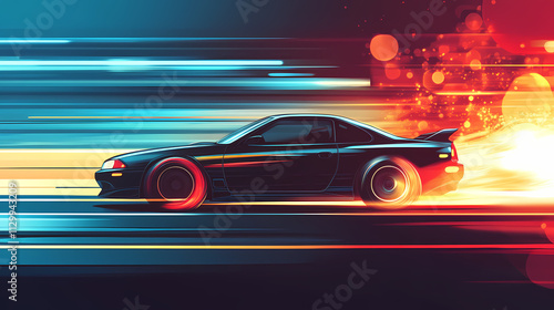 A black car driving on the road, with a blurred background. Drift. Illustration