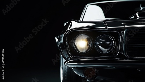 A black car with headlights, close-up, against a black background