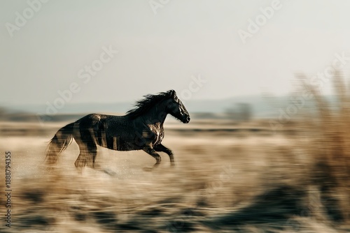 A black horse gallops across grassy dunes, jumping water puddles in a poetic cinematic scene