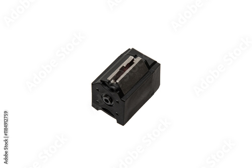 A black magazine for a small-caliber rifle with a red follower, isolated on a white background