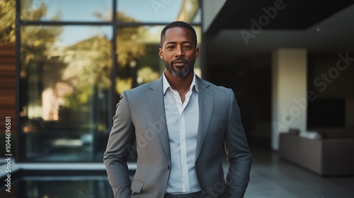 A black man in his late thirties wearing an elegant grey suit, standing confidently at the entrance of a modern home with large windows and glass walls