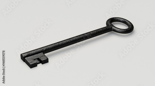 key, single, black, metal, resting, light, grey, background, worn, appearance, old, round, head, keyhole, rectangular, body, typical, opening, lock, design, simple, functional, additional, embellishment, decoration, grey background