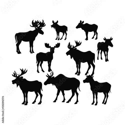 A black moose silhouette vector illustration depicts a wild mammal with antlers isolated on white.