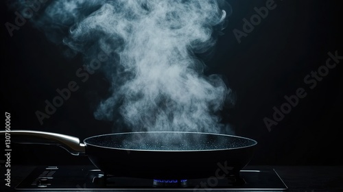 pan, smoke, cooking, steam, kitchen, heat, gas, stove, handle, black, silver, surface, appliance, flames, fume, vapour, hot, utensil, simmer, boil, fries, sauté, ventilated, extractor, mist, cloud, air, condensation, liquid, evaporation