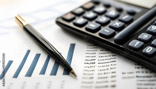 A Black Pen, Calculator, and Bar Graph on a White Desk