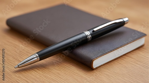 A black pen rests elegantly on a closed brown notebook on a wooden surface suggesting professional work or study