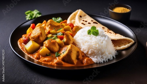 A black plate holds chicken curry with potatoes and other vegetables, served with rice and a roti