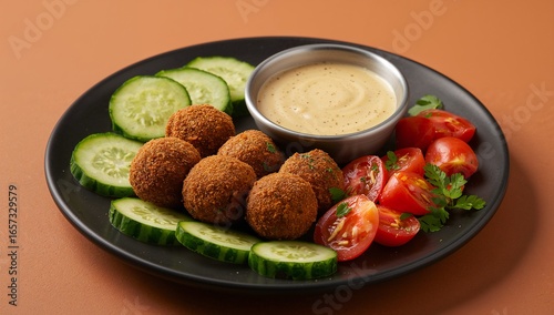 A black plate of falafel balls with sliced cucumbers and cherry tomatoes.