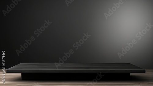 A black platform on a wooden floor in front of a black wall