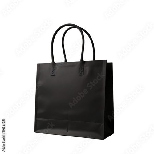 a black, rectangular, paper gift bag with black rope handles isolated on transparent background