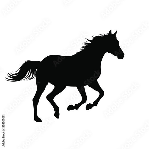 A black silhouette of a horse in a cartoon style, running with a cute and dynamic pose against a plain white background.