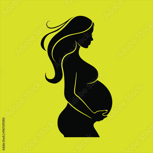 a black silhouette of a pregnant woman with long hair, holding her belly, set against a yellow background.