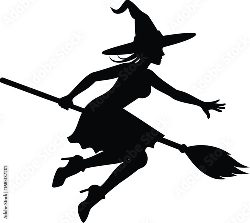 A black silhouette of a witch in a pointed hat and flowing dress rides a broomstick through the air.