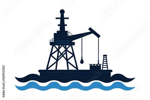 A black silhouette of an offshore oil rig platform with derricks on a white background