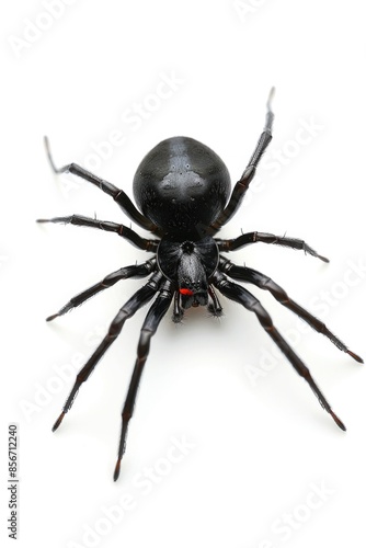 A black spider sits on a white surface, awaiting prey