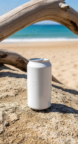 can, aluminium, drink, soda, beverage, metal, blank, empty, object, pop, sweet, fizzy, refreshment, cold, shiny, metallic, liquid, container, pack, package, product, single, 1, beach, sand, sea, ocean, summer, vertical, copy, space, rock, stone, wood, driftwood