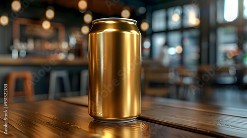 A blank gold can sits on a wooden bar table, set against a cozy pub interior with warm lighting. Ideal for branding and product mockups in a casual, relaxed setting.