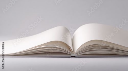 A blank, open book lies flat, showcasing its empty pages against a soft, neutral background.