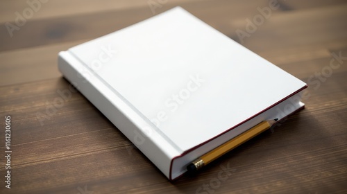 A blank white book with a pencil rests on a wooden table, symbolizing creativity and potential