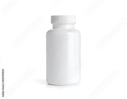 A blank white medical pill bottle container isolated on a white background. Mockup template for pharmaceutical or vitamin supplement design.