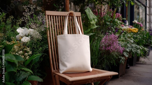 A blank white tote bag sits on an outdoor wooden chair, surrounded by fresh flowers and plants in the background of an urban flower shop, showcasing the organic cotton fabric.