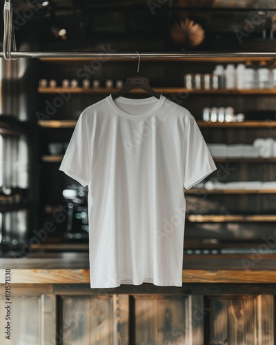 A blank white t-shirt hangs on a wooden hanger against a blurred background showcasing a retail display environment