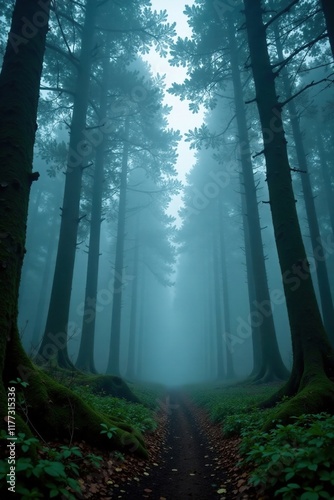 A blanket of fog envelops a forest, shrouding it in mystery, veiled woods, misty atmosphere, secret forest