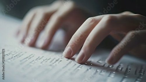 A blind person's hands scanning Braille text on a page, showcasing accessibility and inclusion in education.