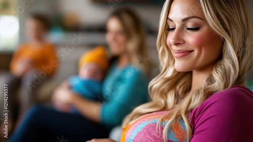A blissful mother smiles serenely while holding her baby in a warm living room, surrounded by family, encapsulating the loving atmosphere of familial connections and moments of joy.