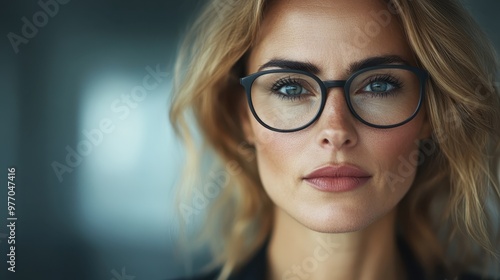 A blonde woman wearing glasses gazes confidently into the camera, showcasing contemporary professionalism and poise against a modern blurred backdrop.
