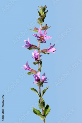 A blooming branch of purple loosestrife (Lythrum salicaria) near a river bed in autumn
