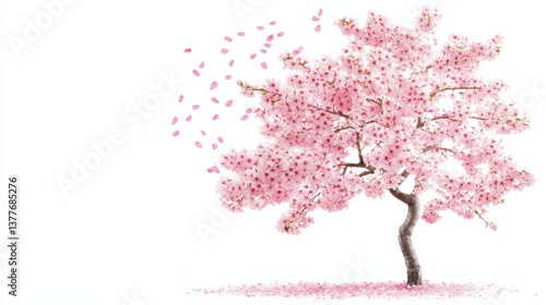 A blooming cherry blossom tree with pink petals falling,
