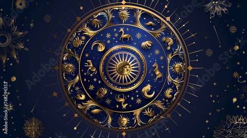 a blue and gold astrological clock surrounded by stars and sparkles on a dark background