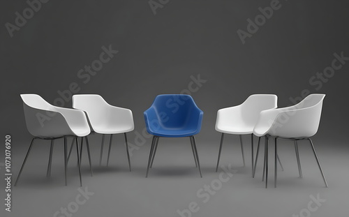 A blue chair stands out from the row of white