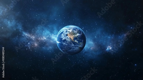 A blue Earth in space, against a dark background, with a galaxy and stars. The planet Earth is depicted in a wide-angle