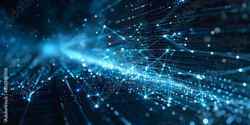 A blue glowing light beam with digital data and connections on a black background, an abstract futuristic technology banner design for an internet network connection or big data