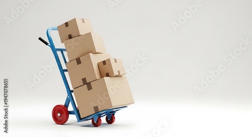 A blue hand truck loaded with stacked cardboard boxes on a white background
