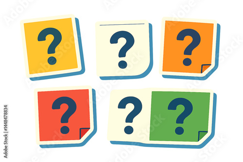 A blue panoramic background features a vector isolated illustration of sticker reminders with question marks