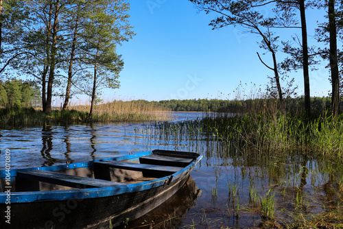 A blue wooden boat moored on the shore of a lake, Borki, Warmian-Masurian Voivodeship, Poland