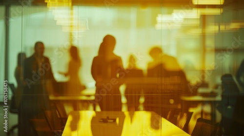 A blurred photograph capturing business people in an office,a high-tech company with soft yellow accents.