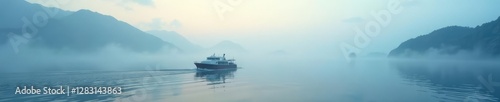 A boat sailing through a veil of mist on an open sea with distant mountains, sea, mist, calm