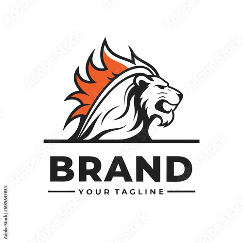 "A bold and modern vector logo of a roaring lion’s head with a fiery mane. The mane blends shades of orange and red flames, symbolizing power, strength, and energy.