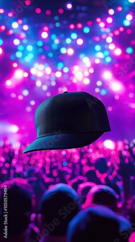 cap, stage, crowd, festival, light, energy, cheering, colourful, design, apparel, performance, celebration, atmosphere, fashion, urban, creativity, accessory, model, spectacle, event, nightlife, music, trend, innovation, showcase, vibrant, uniqueness, youth, culture, entertainment, individuality, audience, excitement, style, projection, branding, promotional, marketing, engagement, fun, summer, visual, art, product, display, pop, modern, showmanship