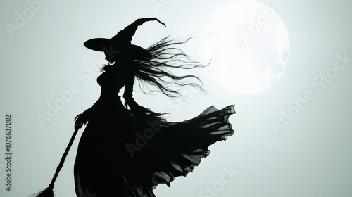 A bold silhouette of a witch surrounded by flying bats, set against a luminous white background.