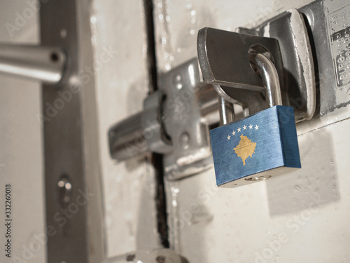 A bolted door secured by a padlock with the national flag of Kosovo on it.(series)